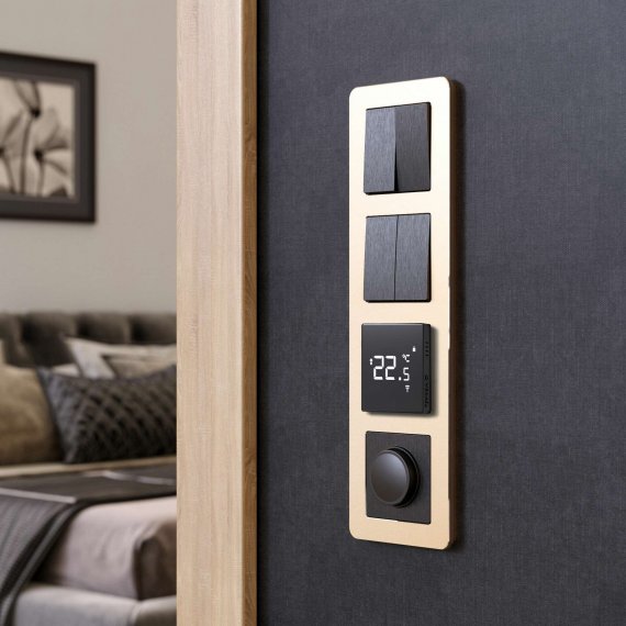 Platinum — коллекция рамок из литого анодированного алюминия. Сатиновая поверхность с шероховатой фактурой и изящные акцентные фаски на гранях создают премиальный дизайн, который подчеркивается благодаря увеличенным размерам рамки — 95×95 мм.