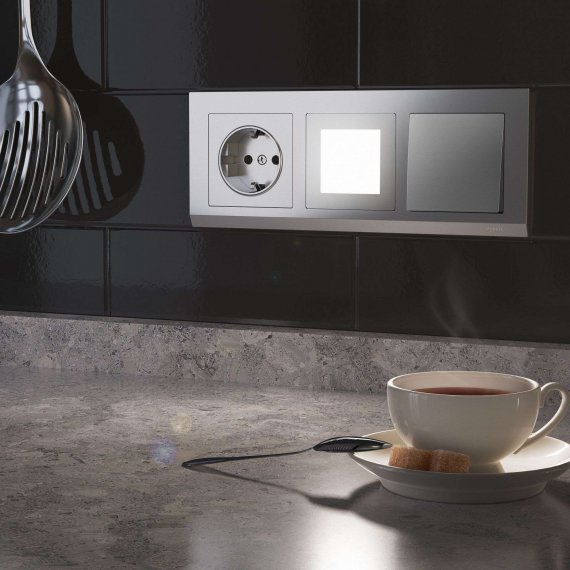 Электроустановочное изделие монтируется в установочную коробку, оставляя видимым только внешнюю лицевую панель и накладную рамку. Механизм для скрытой установки оснащен суппортом из нержавеющей стали, позволяющий крепко зафиксировать изделие в подрозетнике. Надежные контакты из фосфористой бронзы и серебра выдерживают большую нагрузку и обладают большим эксплуатационным ресурсом 40 000 циклов.