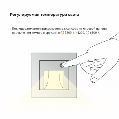• Регулируемая цветовая температура. Сенсорный переключатель позволяет выбрать теплый (3300К), нейтральный (4200К) или холодный (6500К) свет одним прикосновением.