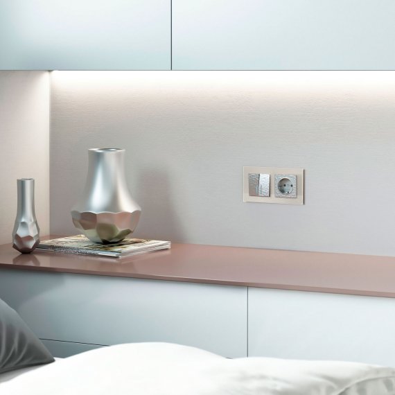 Электроустановочное изделие монтируется в установочную коробку, оставляя видимым только внешнюю лицевую панель и накладную рамку. Механизм для скрытой установки оснащен суппортом из нержавеющей стали, позволяющий крепко зафиксировать изделие в подрозетнике. Надежные контакты из фосфористой бронзы и серебра выдерживают большую нагрузку и обладают большим эксплуатационным ресурсом 40 000 циклов.