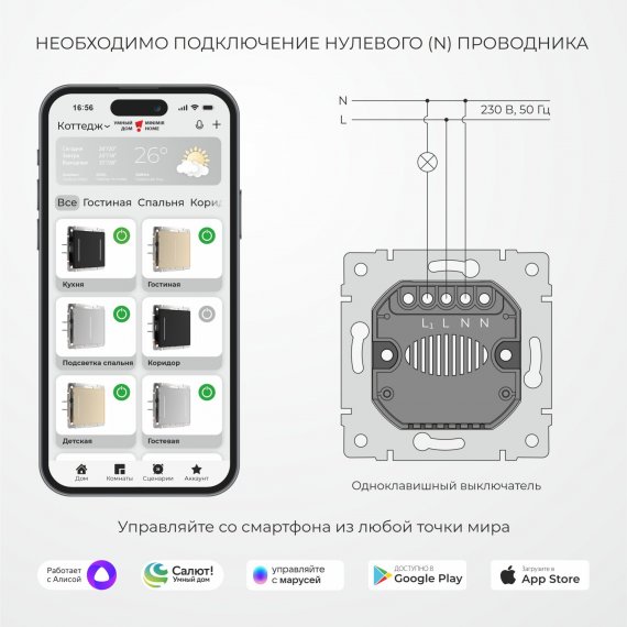 Для работы умного выключателя требуется подключение нулевого проводника.