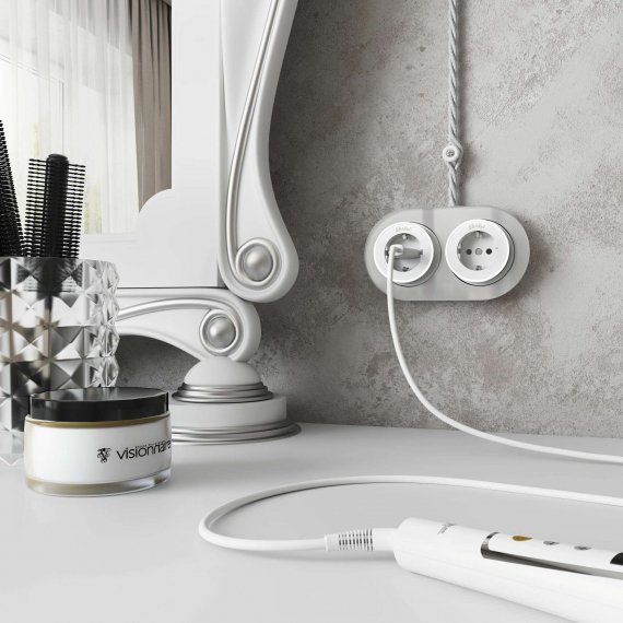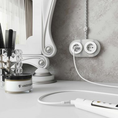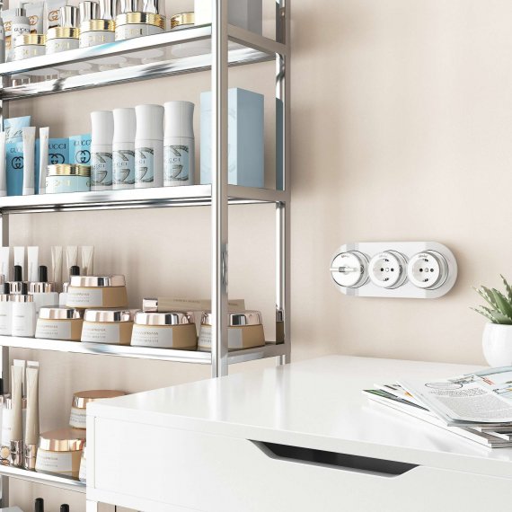Дополнить образ помогут рамки Werkel из металла, стекла, и дерева, а также аксессуары для накладного монтажа проводки.