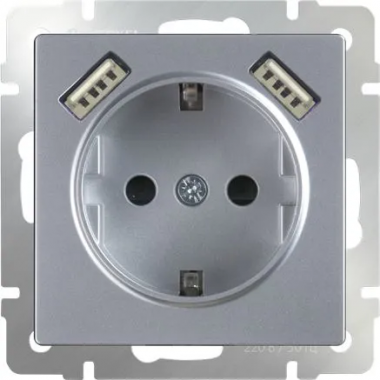 WL06-SKGS-USBx2-IP20 / Розетка с заземлением, шторками и USBх2 (серебряный)